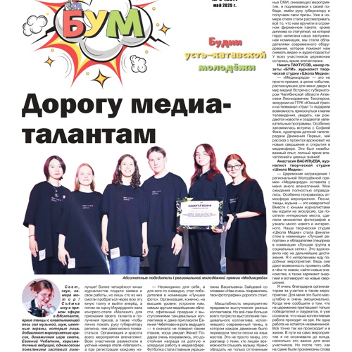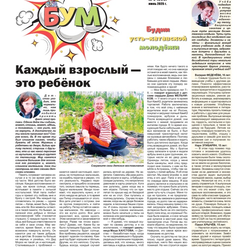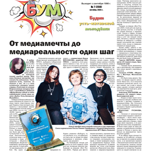 «БУМ» - детско-юношеская городская газета "Будни усть-катавской молодёжи" Создана в сентябре 1998 года в Центре детского творчества Усть-Катавского городского округа. В течение трех лет выходила тиражом 999 экземпляров и распространялась по школам. Первый редактор - С.И. Попкова. Как самостоятельное издание «БУМ»... Читать еще