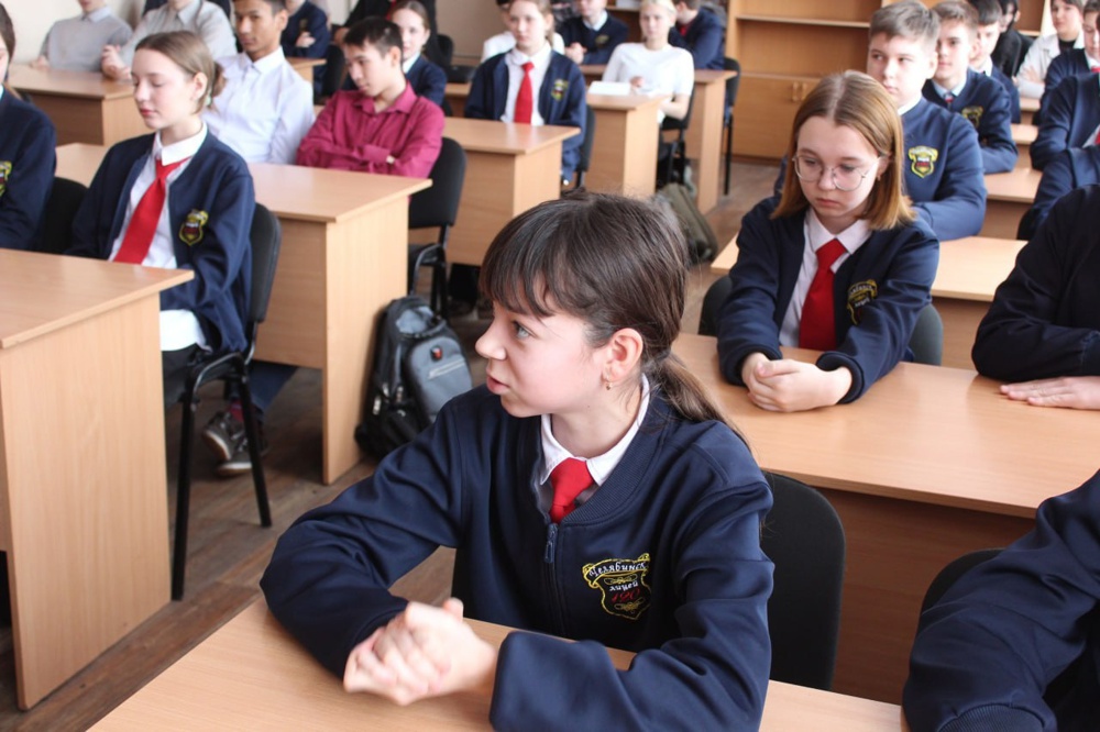 Урок оказался интерактивным, потому что представители команды «Боевое братство», участники СВО Никита и Константин больше экзаменовали нас. Например, мы рассказывали им, что обозначают цвета Российского Флага или как правильно наложить ждут в случае оказания первой помощи.
