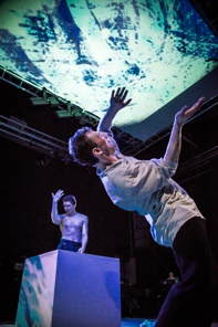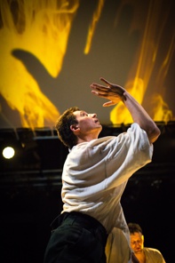 В основе текста, который читают актеры — письма Ван Гога брату Тео и эссе Арто, посвященное «самоубитому обществом художнику». Но как же вторичен этот текст! Актеры его проглатывают, душат предплечьями, зажимают в зубах, бросают на полпути. Тут же наговаривают что-то быстрое, словно накладывают свежий слой краски поверх только что сказанного. Потому что больше они сосредоточены на движениях тел. Винсент (Денис Саратников) и Арто (Александр Зайцев), никогда не знакомые лично, вдруг находят общий язык живых неподконтрольных эмоций, импульсивных движений по наитию (на самом деле в строгом соответствии с фантастической схемой хореографа Екатерины Галановой). В общем, как показалось мне – пластически и визуально этот спектакль намного сильнее, чем на уровне текста.