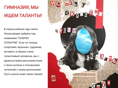 «Название "ЭКОША" очень древнее. Оно связано с экономической направленностью гимназии, но теперь мы придумываем новое оформление изданию. Мы стремимся к современному подходу и свободе творчества. Одна девочка даже писала материал про цыганские свадьбы.
